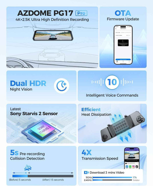 AZDOME PG17 PRO NEW 11.8" 4K Dual Camera Dash Cam - Enhanced Driving Safety and Clarity